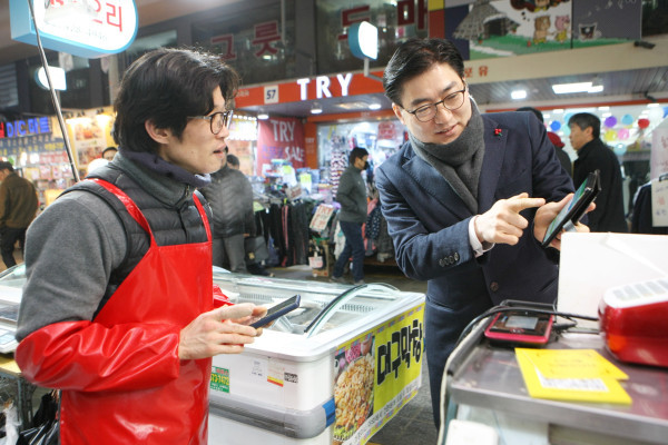 이정훈 서울 강동구청장이 지난 15일 암사종합시장을 방문해 제로페이 가맹점에서 결제를 직접하며 상인과 주민들에게 제로페이 가입을 독려했다. 사진은 이 구청장(오른쪽)이 암사종합시장내 점포에서 상품 구매 후 제로페이로 결제하는 모습. (사진제공=강동구청)