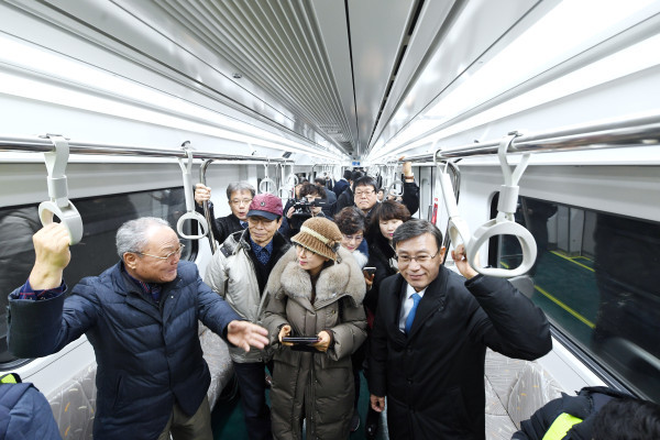 경기 김포시는 지난 15일 대중교통기획단 및 운수업체 관계자 등 60여명이 참석한 가운데 오는 7월 말 개통예정인 '김포도시철도 시승식'을 했다. 사진은 시승식에 참석한 정하영 시장(앞줄 오른쪽) 및 관계자들이 이야기를 나누고 있는 모습. (사진제공=김포시청)