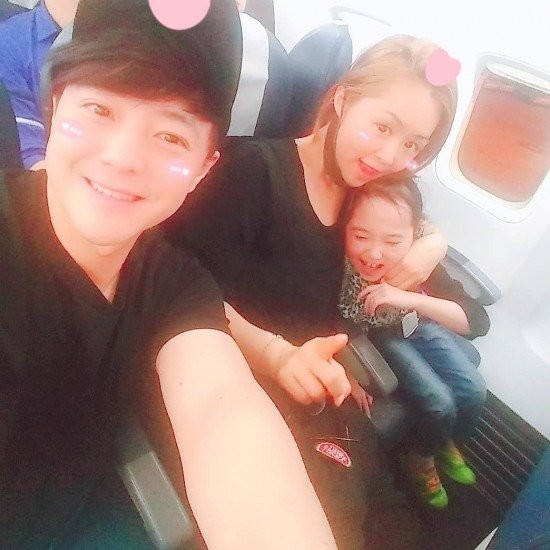 공개된 사진 속 노유민은 아내 및 딸과 함께 기내에서 환한 미소로 카메라를 응시하고 있다.