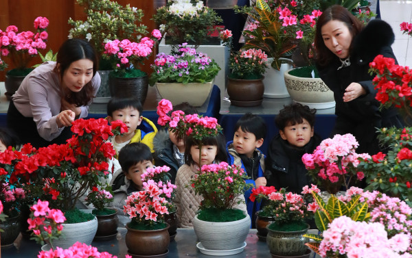 18일 서초구청 서초플라자에서 열린 2019 서초 봄꽃 전시-홍보 판매전을 찾은 어린이들이 철쭉 등 전시된 꽃을 관람하고 있다.