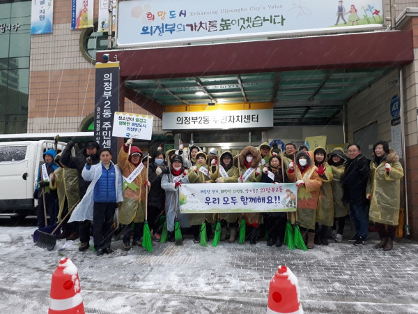 경기 의정부시 의정부2동은 최근 갑작스러운 폭설에 따라 자율청결봉사대 및 제설봉사단, 자생단체회원과 공무원 등 80여명이 자발적으로 참여한 가운데 제설작업과 대청소를 실시했다. 사진은 이날 제설작업을 한 주민들이 기념촬영을 하는 모습. (사진제공=의정부시청)