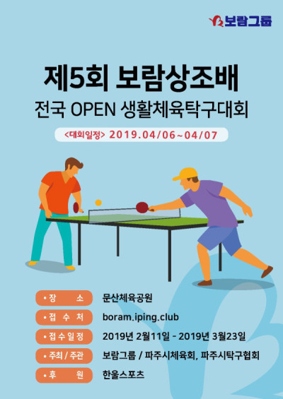보람그룹과 파주시, 파주시체육회·파주시탁구협회가 공동 주최 및 주관하고 한울스포츠가 후원하는 이번 탁구대회는 오는 4월6~7일 양일간 파주시 문산읍에 위치한 문산체육공원에서 진행된다.