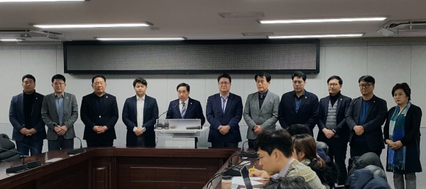 | ▲ 18일 송춘규 서구의회 의장(왼쪽에서 다섯번째)을 비롯한 의원들이 기자회견장에서 이학재 의원의 공개적인 사과를 요구하는 성명서를 발표하고 있다. (사진제공=서구의회) | ||