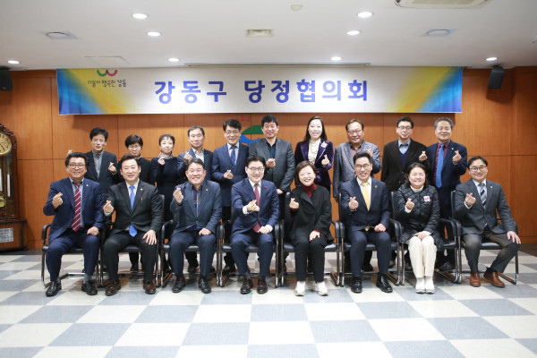 강동구가 지난 16일 오후 3시 구청 회의실에서 더불어민주당 강동갑지역위원회와 ‘2019년 1분기 당정협의회’를 개최했다. 사진은 이정훈 구청장(왼쪽 앞에서 네번째)과 진선미 의원 및 관계자들이 협의회를 마치고 기념촬영을 하는 모습. (사진제공=강동구청)