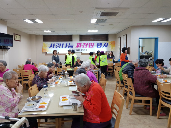 경기 이천시 농업생명대학총동문회는 최근 2019년 신년 봉사활동을 펼쳤다. 1차 봉사로 신둔면 딸기농장에서 일손을 도왔으며, 2차 봉사로는 노인요양시설 한나원에서 150인분의 짜장면을 대접했다. 사진은 노인들에게 짜장면을 대접하는 모습. (사진제공=이천시청)