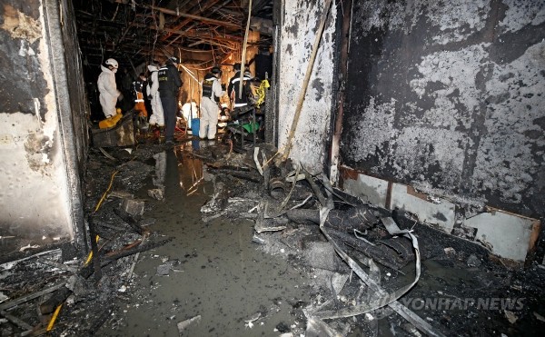 소방과 경찰 등이 19일 화재가 발생한 대구시 중구 포정동 한 사우나 건물 남자목욕탕에서 합동감식을 하고 있다.