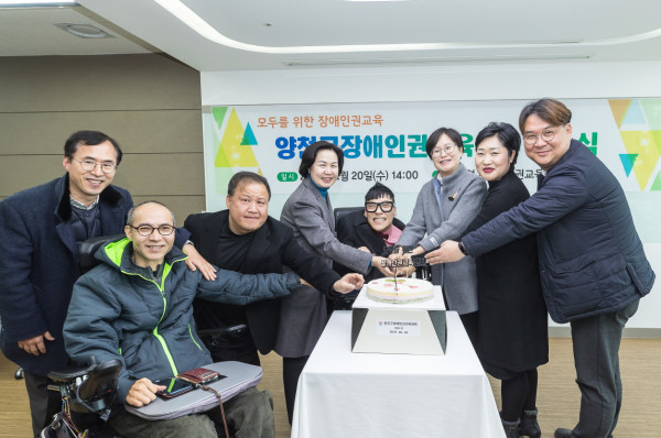서울 양천구가 20일 해누리타운 4층에서 ‘양천구 장애인권교육센터 개소식’을 개최했다. 이날 행사는 김수영 구청장을 비롯해 지역주민 등 약 100명이 참석했다. 사진은 김 구청장(왼쪽에서 네 번째)과 관계자들이 케이크 커팅을 하는 모습. (사진제공=양천구청)