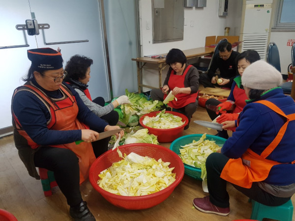 경기 수원시 권선구 권선1동 새마을부녀회 회원들은 지난 19일 직접 담근 김치, 제육볶음, 육개장, 모듬전 등의 음식들을 어려운 이웃들에게 전달했다. 사진은 부녀회 회원들이 음식 재료를 손질하고 있는 모습. (사진제공=수원시청)