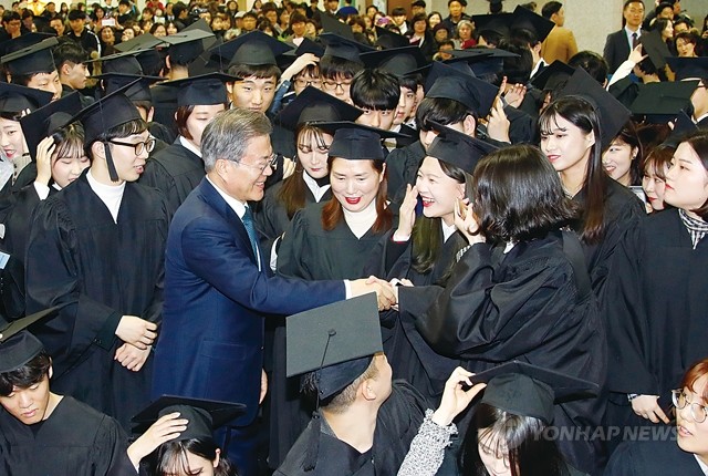 문재인 대통령이 21일 오전 경기도 부천시 유한대학교에서 열린 졸업식에서 졸업생들과 함께 기념촬영을 마친 뒤 학생들을 격려하고 있다. 유한대학교는 독립운동가이자 기업인, 교육자로 한평생 국민과 국가를 위해 봉사한 유일한 박사가 설립한 학교로 현재 고등직업교육 기관으로 높은 평가를 받는 대학이다.
