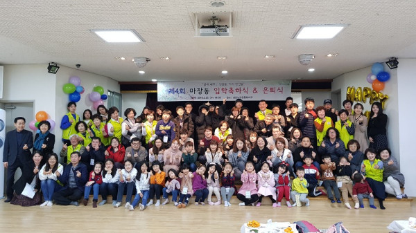 서울 성동구는 최근 노인종합복지관 강당에서 ‘제4회 마장동 입학 축하·은퇴식’을 개최했다. 이번 행사는 입학하는 자녀와 은퇴하는 부모가 있는 가족들이 공연을 관람하고 음식 나눔 등을 하는 시간으로 진행됐다. 사진은 기념촬영을 하는 모습. (사진제공=성동구청)