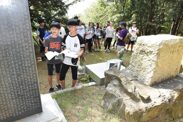| ▲ 망우리공원 역사기행에 참여한 청소년들이 독립운동지사들의 묘역을 살펴보고 있다. (사진제공=중랑구청) | ||
