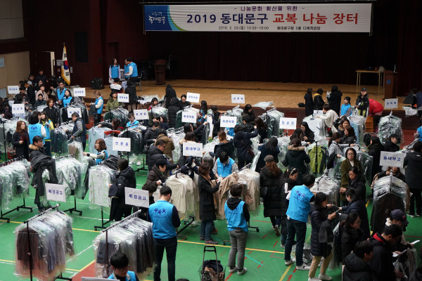 서울 동대문구가 지난 23일 구청 2층 다목적 강당에서 ‘2019 동대문구 교복 나눔 장터’를 개최했다. 이번 행사는 지역내 중·고등학교 17곳 졸업생들의 기증을 통해 마련됐다. 사진은 행사장을 찾은 학부모와 학생들이 교복을 고르는 모습. (사진제공=동대문구청)