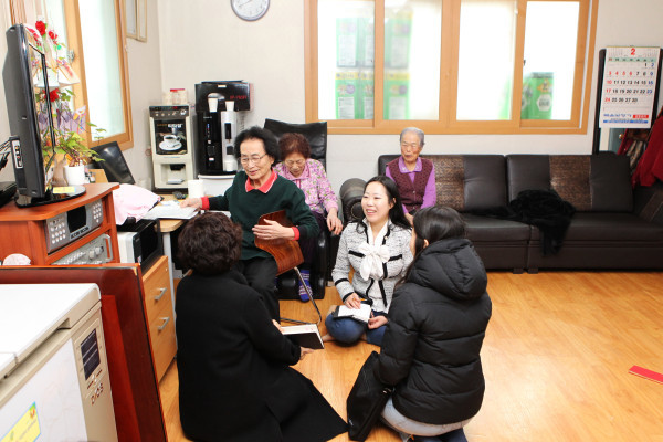 | ▲ 경로당을 방문한 진선미 의원(가운데)이 노인들과 이야기를 나누고 있다. (사진제공=강동구의회) | ||