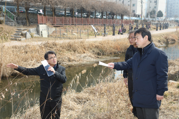 경기 수원시 권선구는 25일 지역내 지방하천 4곳 및 소하천 8곳에 대한 하천 일제점검을 실시했다. 사진은 이택용 구청장(오른쪽)이 관계자들과 함께 하천을 점검하고 있는 모습. (사진제공=수원시청)