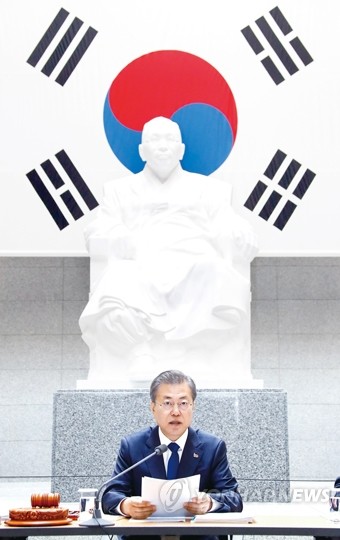 문재인 대통령이 26일 오전 서울 용산구 백범 기념관에서 열린 국무회의에서 발언하고 있다.