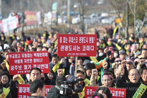 공주시민들이 26일 오전 공주보 앞에서 집회를 열고 환경부 4대강 조사·평가 위원회의 공주보 부분해체 의견에 반대하고 있다.