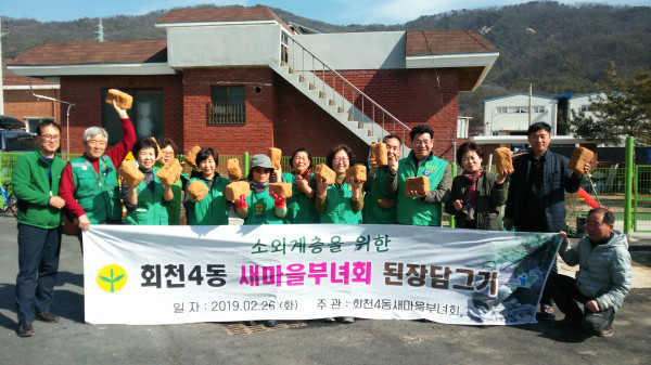 경기 양주시 회천4동 새마을부녀회는 26일 지역내 취약계층 지원을 위한 된장 담그기 행사를 개최했다. 이날 담근 된장은 지역내 노인들과 소외계층에 전달할 예정이다. 사진은 행사 참여 관계자들이 매주를 들고 기념촬영을 하는 모습. (사진제공=양주시청)
