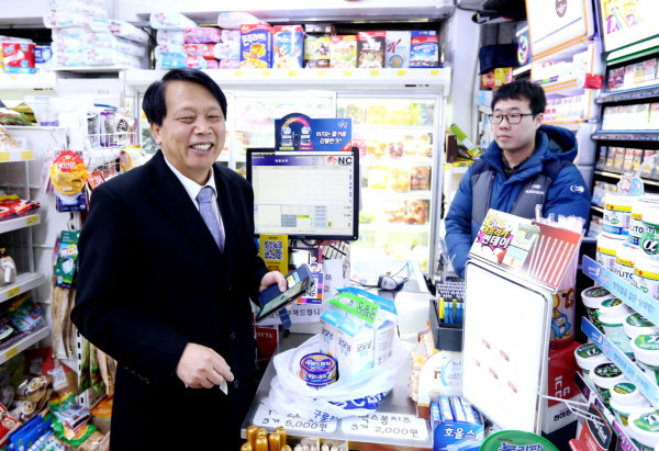 26일 이성 구로구청장이 ‘제로페이 챌린지’에 참여하기 위해 구청 근처 슈퍼마켓에서 제로페이를 이용해 물건을 구입했다. 사진은 제로페이를 이용해 물건을 구매하고 있는 이 구청장의 모습. (사진제공=구로구청)