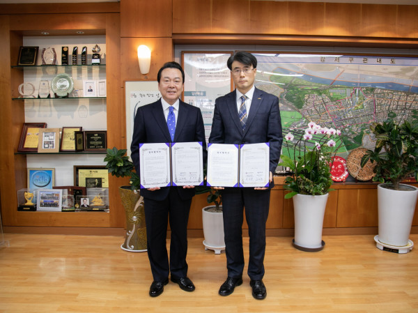 서울 강서구는 26일 한국건강관리협회 서울서부지부와 함께 구청에서 ‘어린이집 아동 요충검사 업무협약’을 체결했다. 사진은 이날 협약식에서 협약서 서명을 마치고 노현송 구청장(왼쪽)과 협회 관계자가 기념촬영을 하는 모습. (사진제공=강서구청)