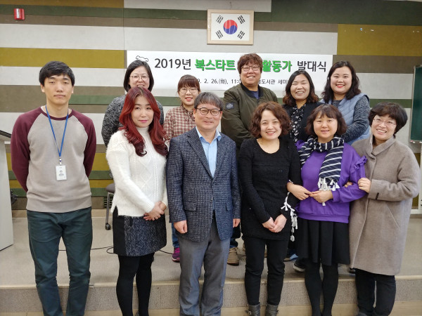 경기 포천시는 26일 소흘도서관에서 ‘2019년 포천시립도서관 북스타트 자원활동가’ 발대식을 개최했다. 북스타트 자원활동가는 아기들에게 그림책 읽어주기 및 책놀이 등을 진행한다. 사진은 자원활동가들과 관계자들이 기념촬영을 하는 모습. (사진제공=포천시청)