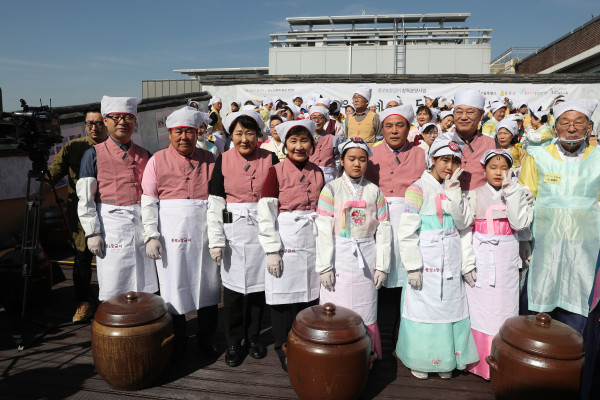 지난 26일 서울 종로구의회 의원들이 종로노인종합복지관에서 열린 ‘우리동네 장 담그는 날’ 행사에 참석, 된장과 간장을 직접 담갔다. 사진은 행사에 참석한 아이들과 함께 장을 담그고 기념촬영을 하는 의원들의 모습. (사진제공=종로구의회)
