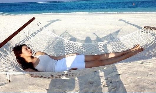 사진 속에서 수현은 해변가를 배경으로 해먹에 누워 눈을 감고 있다. 몸매가 드러나는 흰 옷으로 8등신 몸매가 시선을 끈다.