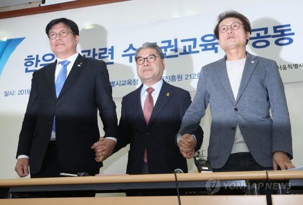 사립유치원단체 한국유치원총연합회(한유총)가 개학연기를 강행키로 한 3일 서울 종로구 서울시교육청에서 조희연 서울교육감(오른쪽부터), 이재정 경기교육감, 도성훈 인천교육감이 이와 관련한 기자회견을 마친 뒤 손을 맞잡고 인사하고 있다.