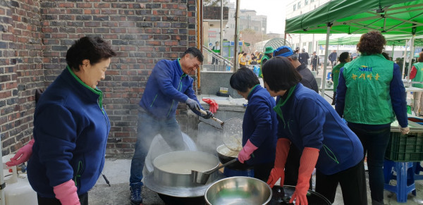 경기 여주시 새마을회는 지난 1일 여주시민회관 주차장에 마련된 행사장에서 3.1운동 100주년 기념행사에 참여한 700여명의 시민에게 떡국나눔 봉사를 실시했다. 사진은 새마을회 봉사자들이 시민들에게 대접할 떡국을 준비하고 있는 모습. (사진제공=여주시청)