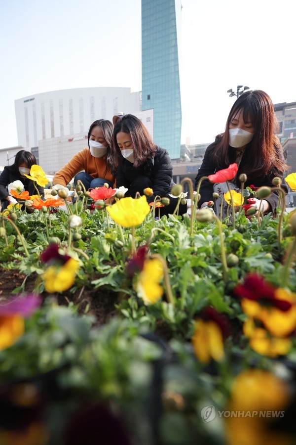4일 오전 성동구 왕십리역 광장에서 구 직원들이 새봄맞이 화단 조성 작업을 하고 있다.
