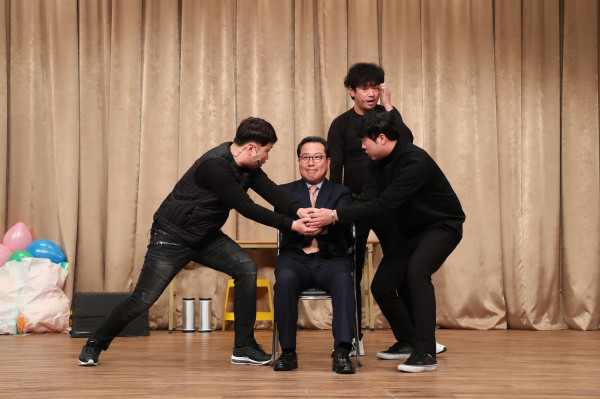 경기 남양주시는 4일 시청 다산홀에서 3월 월례조회를 ‘직원초대’라는 이름으로 새롭게 진행했다. 사진은 조광한 시장(가운데)이 직접 마술쇼에 참여해 개그맨들과 공연을 선보이는 모습. (사진제공=남양주시청)