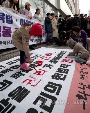 5일 오전 서울 용산구 한국유치원총연합회(한유총) 사무실 앞에서 '정치하는 엄마들' 주최로 열린 검찰고발 기자회견에서 어린이들이 한유총을 규탄하는 퍼포먼스를 하고 있다. 이날 정치하는 엄마들은 한유총과 소속 유치원을 공정거래법 및 유아교육법, 아동복지법 위반 혐의로 검찰 고발한다.