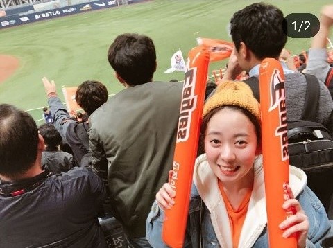 사진 속 송상은은 노란색 비니를 쓰고 한화 이글스 응원막대를 들고 있다. 겉옷에 숨겨진 오렌지색 후드를 통해 한화 이글스의 열혈팬임을 인증하고 있다.