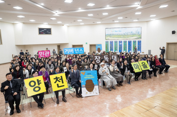 김수영 서울 양천구청장이 5일 오전 양천구청 3층 양천홀에서 열린 ‘2019 이웃과 함께하는 양천마을 장독대 발대식’에 참여했다. 이웃과 함께하는 양천마을 장독대는 구민들이 참여해 전통장을 만드는 사업이다. 사진은 김 구청장이 주민들과 기념촬영을 하는 모습. (사진제공=양천구청)