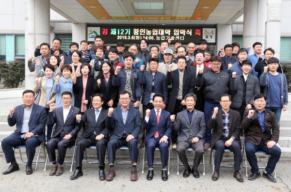 전남 영암군은 5일 농업기술센터에서 한우 고급육 생산을 위한 전문 농업인 양성을 위해 '제12기 왕인농업대학 입학식'을 개최했다. 사진은 입학식 후 전동평 군수(앞줄 오른쪽에서 네 번째)가 입학생 및 관계자들과 기념촬영을 하는 모습. (사진제공=영암군청)