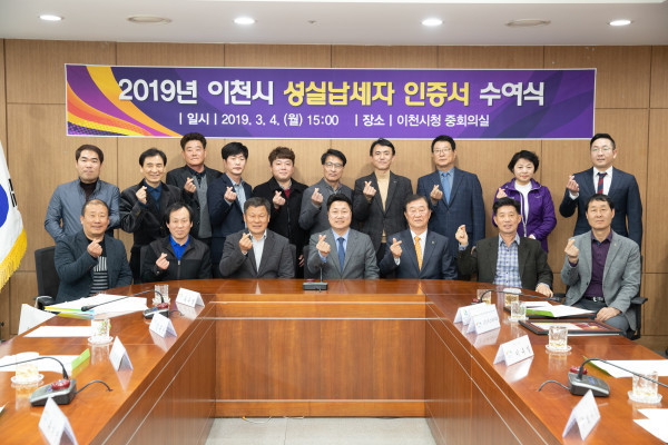 경기 이천시는 (주)에스와이디, (주)대일환경과 선정한 지역내 성실납세자 16명에게 지난 4일 시청 중회의실에서 ‘2019년 이천시 성실납세자’ 인증서를 수여했다. 사진은 엄태준 시장(앞줄 가운데)과 인증서를 수여받은 납세자들의 기념촬영 모습. (사진제공=이천시청)
