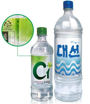 | ▲ [친환경 비접착식 라벨이 부착된 대선소주와 시원(C1)소주 페트병 제품] | ||