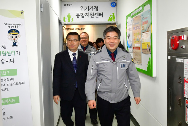 류경기 서울 중랑구청장과 민갑룡 경찰청장이 지난 5일 오전 중랑구 위기가정 통합지원센터를 방문해 가정폭력 근절을 위한 지역공동체 간 협력 방안에 대해 논의했다. 사진은 류 구청장(왼쪽) 및 민 청장(오른쪽)이 센터를 살펴보고 있는 모습. (사진제공=중랑구청)