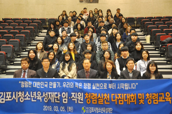 경기 김포시청소년육성재단은 지난 5일 김포중봉청소년수련관 대강당에서 조직내 청렴문화 정착과 청렴실천의지 함양을 위한 청렴실천다짐대회와 청렴교육·청탁금지법 주요사례공유 간담회를 개최했다. 사진은 간담회 참여자들이 기념촬영을 하는 모습. (사진제공=김포시청소년육성재단)