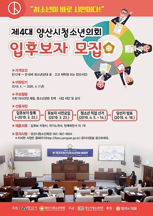 양산시청소년회관에서는 청소년의 정책, 권익보호, 참여활동에 관심이 많은 청소년의회 의원 입후보자를 모집한다. 청소년의회는 양산시의회를 모티브로 청소년의 자치권과 사회참여 기회 확대를 위하여 관내 청소년들의 직접 선거를 통해 선발된 청소년들로 의회를 구성한다. 선출된 의원은 의회 의사과정 체험과 청소년관련 정책·사업 제안 등의 활동을 할 계획으로 청소년의원에게는 활동에 필요한 각종 교육·체험·교류활동의 기회와 자원봉사활동 시간을 제공하고, 위촉장과 활동증명서를 발급한다.