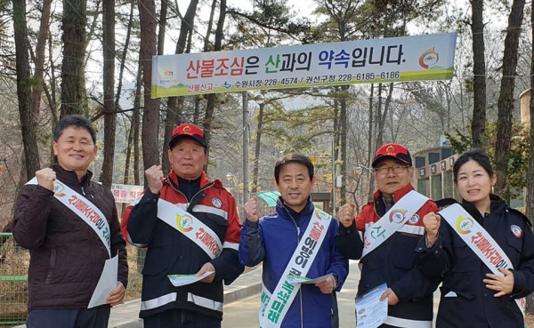 이택용 경기 수원시 권선구청장이 7일 오후 봄철 산불방지를 위해 산불감시초소 현장을 방문, 건조한 날씨로 산불위험도가 높아짐에 대비해 각별한 주의를 당부하고 산불 예방을 위한 시설·장비 점검 및 입산객에 대한 홍보를 실시했다. 사진은 입산객을 대상으로 홍보를 하고 있는 이 구청장(가운데)의 모습. (사진제공=수원시청)