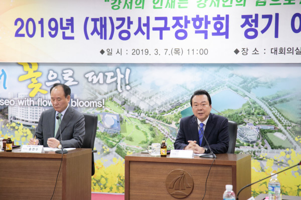 강서구가 최근 구청 대회의실에서 2018년도 사업실적 보고, 결산감사 승인, 2019년 사업계획 및 장학기금 확충방안 논의 등을 위한 장학회 정기 이사회를 개최했다. 사진은 노현송 구청장(오른쪽)이 회의를 주재하고 있는 모습. (사진제공=강서구청)