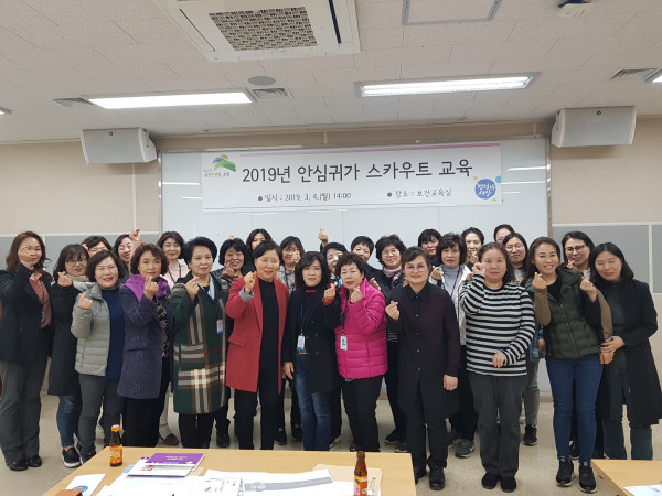 | ▲ 지난 4일 실시된 '2019년 안심귀가 스카우트 교육'을 수료한 참가자들이 기념촬영을 하고 있다. | ||