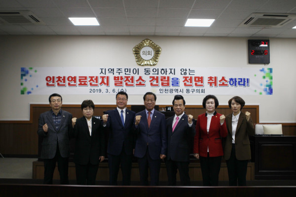이날 채택된 결의안에는 ▲정부는 동구 주민들의 동의를 구하지 않은 인천 동구 송림동 8-849 일원의 인천 연료전지 발전소 건립을 전면 취소하라 ▲정부와 인천시는 발전소 건립을 원점에서 재검토하라 ▲동구청은 주민들의 의견 수렴을 위한 다각적인 방안을 즉시 마련해 추진하라는 내용이 담겼다.