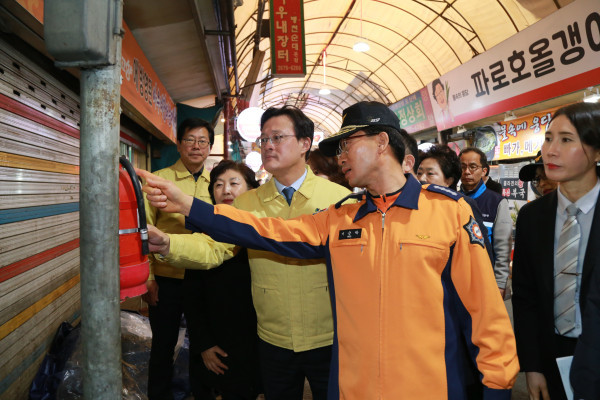영등포소방서는 최근 영등포구청과 합동으로 노후고시원, 영등포 전통시장을 대상으로 화재취약대상 합동 안전점검을 실시했다. 사진은 채현일 구청장과 서순탁 서장이 전통시장내 소화기를 살펴보고 있는 모습. (사진제공=영등포소방서)
