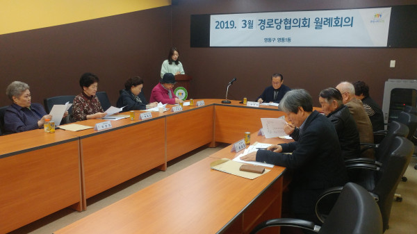 경기 수원시 영통구 영통1동은 최근 행정복지센터에서 지역내 11개 경로당 회장과 영통1동장 및 최영옥 시의원, 맞춤형복지팀장이 참석한 가운데 경로당협의회 정례회의를 개최했다. 사진은 참여자들이 회의하고 있는 모습. (사진제공=수원시청)