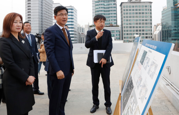 11일 박성수 송파구청장이 중앙전파관리소를 방문했다. 박 구청장은 이 클러스트 조성으로 국가보안기능을 강화하는 동시에 구를 4차산업 성장 거점으로 키울 계획이다. 사진은 관계자로 부터 송파 ICT보안 클러스트 개발 현황 보고를 받고 있는 박 구청장(왼쪽 두번째)의 모습. (사진제공=송파구청)