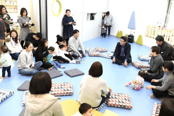 | ▲ 지난 1월 오승록 구청장이 공동육아방에 현장방문해 부모들과 이야기를 나누고 있다. (사진제공=노원구청) | ||