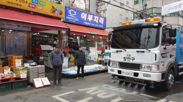 경기 수원시 장안구는 12일 전통시장내 미세먼지 저감을 위해 살수차를 투입해 물청소를 실시했다. 사상 최악의 고농도 미세먼지 발생이 지속되고 비상저감조치 발령이 잦아짐에 따라 구는 유동인구가 많은 전통시장에서 주민 불편을 최소화하기 위해 살수차를 투입했다. 사진은 살수차가 물청소를 하고 있는 모습. (사진제공=수원시청)