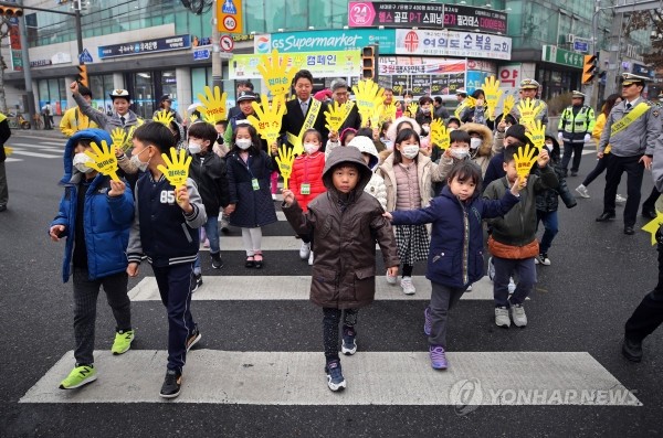 12일 오전 서대문구 북가좌초등학교 앞 사거리에서 어린이 보행안전을 위해 열린 '엄마손 캠페인'에서 어린이들이 길을 건너는 체험실습을 하고 있다.