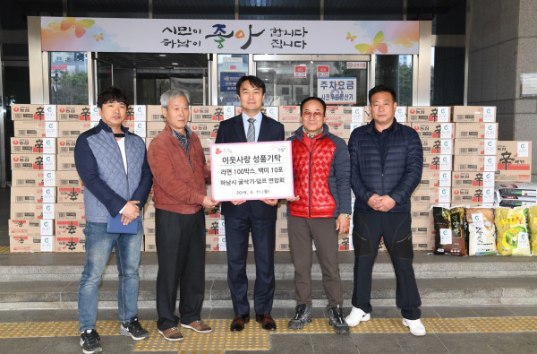경기 하남시 굴삭기·덤프 연합회가 지난 11일 시청을 방문해 라면 100박스, 백미 10kg 5포, 20kg 5포 등 200만원 상당의 이웃돕기 성품을 전달했다. 사진은 김상호 시장(가운데)과 회원들이 기념촬영을 하는 모습. (사진제공=하남시청)